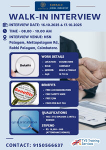 Interview Venue: NSN Palayam, Mettupalayam Rd, Rakki Palayam, Coimbatore.